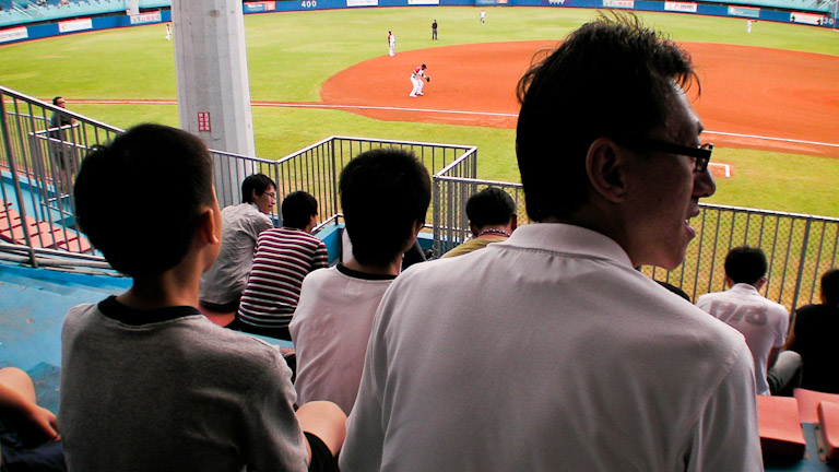 坐下沒多久, 統一林增祥領隊跟兩個似乎是他兒子的剛好坐到我前面...我猜因為它坐我前面的關係當晚我八成也上了幾次鏡頭 XD